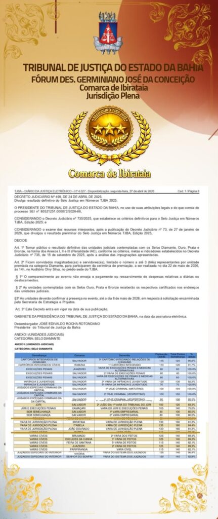 O resultado foi oficializado por meio do Decreto Judiciário nº 499, publicado em 24 de abril de 2026. A premiação leva em consideração critérios rigorosos, como produtividade, eficiência na gestão administrativa e cumprimento de metas estabelecidas pelo Judiciário.