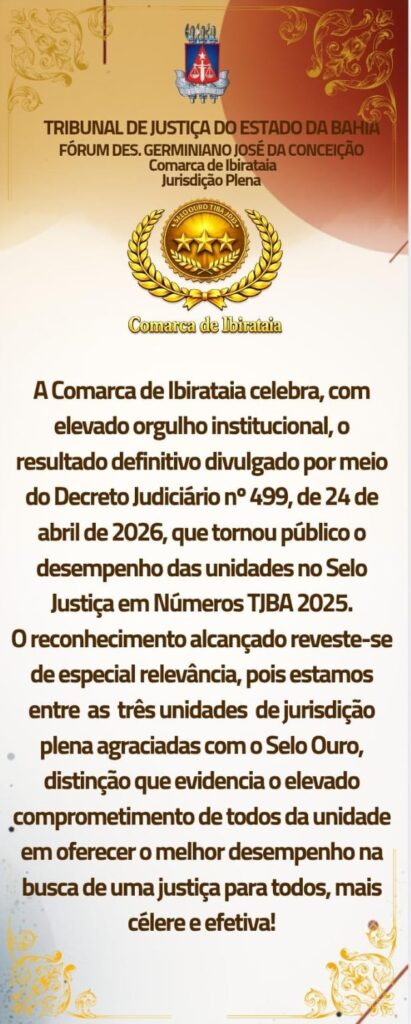 A Comarca de Ibirataia alcançou um importante reconhecimento no cenário jurídico estadual ao ser premiada com o Selo Ouro no programa Justiça em Números 2025, promovido pelo Tribunal de Justiça do Estado da Bahia (TJBA). A honraria evidencia o alto nível de desempenho da unidade, que se destacou entre as comarcas de jurisdição plena em todo o estado.