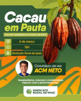 Com o cacau como foco principal, o encontro integra o projeto “Cacau em Pauta”, iniciativa que busca ouvir as propostas dos principais pré-candidatos ao governo estadual para fortalecer a cadeia produtiva do fruto, considerado o carro-chefe da economia local.