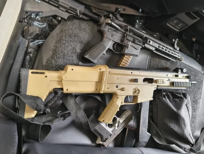 Com ele, foram encontrados, uma submetralhadora SMT calibre 9mm, uma pistola .40 com um carregador e 11 munições, uma carabina 9mm com 44 munições, dois carregadoes calibre 9mm e dinheiro em espécie.